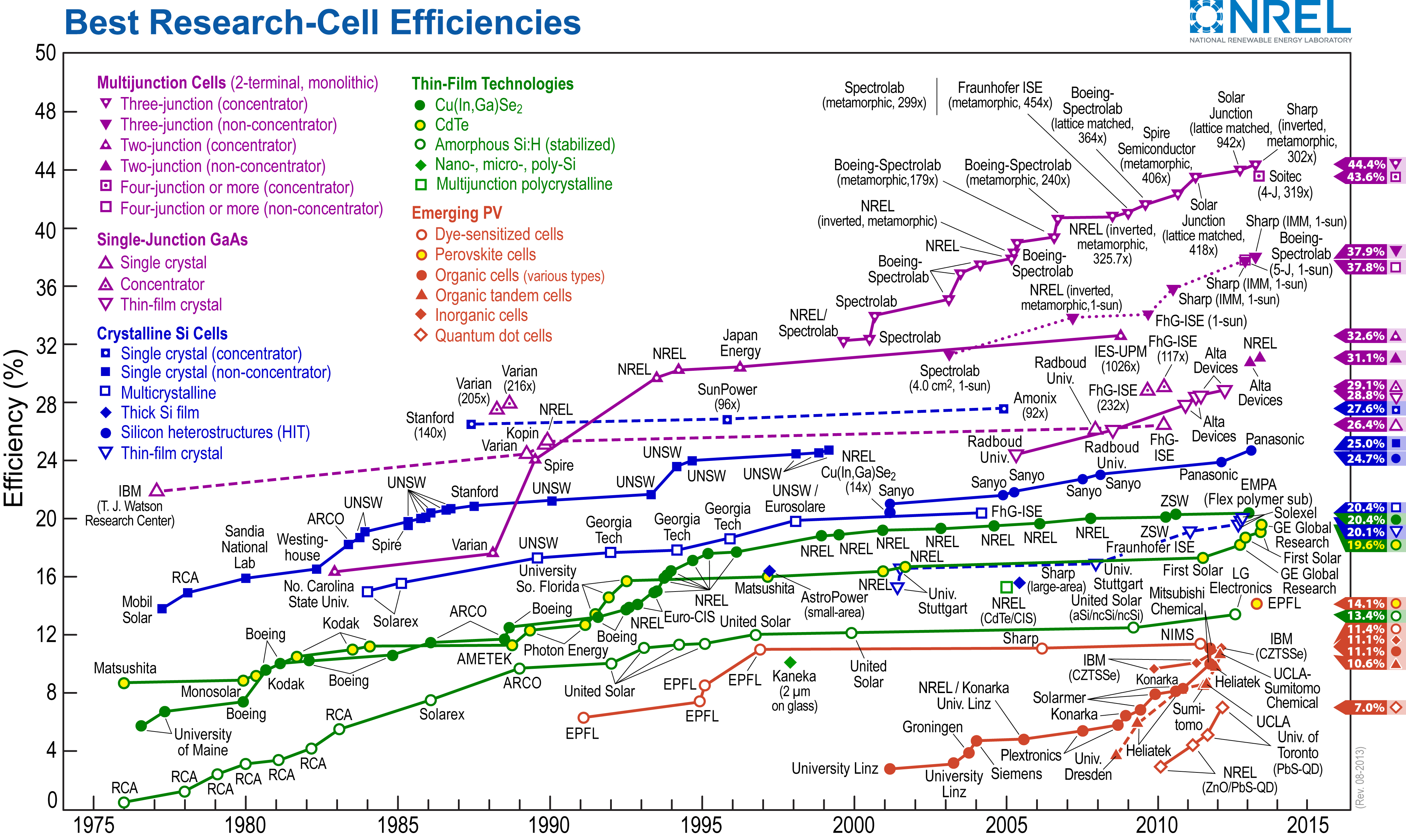 Национальный научно исследовательский центр по изучению фотовольтаики (National Center for Photovoltaics; NCPV), который является частью Национальной лаборатории возобновляемых источников энергии США (National Renewable Energy Lab; NREL), представил график, показывающий тренды и темпы прогресса в области гелиоэнергетики, установленные с далекого 1975 года.